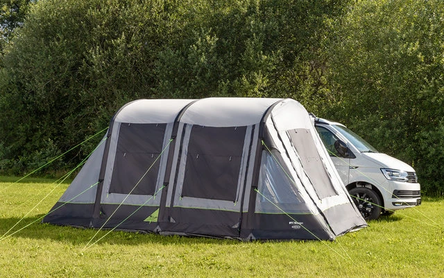 Freistehendes und aufblasbares Busvorzelt für Fahrzeuge mit Regenrinnenhöhe von 180 – 220 cm. Die Gesamthöhe beträgt 240 cm.