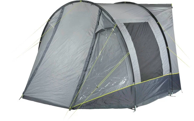 Das Tunnelzelt ist schnell aufgebaut und ideal für Kurztrips. Die verstellbare Dachgestänge stabilisieren das Zelt. Moskitonetz belüften den Wohnbereich und halten Insekten aus dem Zelt. Die innenliegende Reißverschluss-Fensterklappen können einfach und variabel je nach Wetterbedingungen bedient werden. Die Dauerventilationen belüften das Zelt auch an regnerischen Tagen und sollten immer geöffnet sein. Rundum Faulstreifen halten Nässe und Schmutz ab. Extra robuste Reißverschlüsse mit RV-Abdecklappen und Regenrinnen für doppelten Schutz gegen Feuchtigkeit. Neon gelbe Abspannleinen sind in der Dämmerung gut sichtbar.