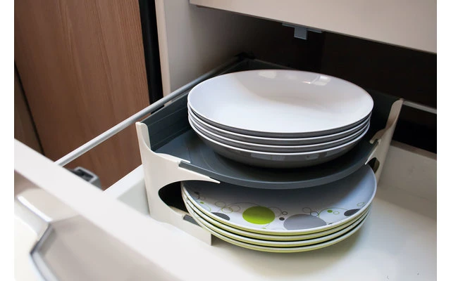 Funktionales und sicheres Transportieren von Tellern während der Reise. Der Tellerhalter EKKOO verhindert, dass das Geschirr klappert und durch die Fahrtvibrationen verkratzt wird. Durch das praktische Design kann der Tellerhalter platzsparend in der Ecke verstaut werden.